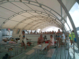 | モアリーフでは、ポンツーン(リーフに浮いてる浮き橋)が活動の拠点になります。ここで、ビュッフェ形式の昼食(BBQ,パン,サラダ,カレー等)や、シュノケーリング,グラスボトムボート,半潜水艦は無料で楽しめます。ここでのシュノケーリングがこのツアーの最大のイベントです。写真やTVでみるような魚たちが泳ぐ姿を目の当たりに見ることができ感激します。なお、ここで使うタオルはホテルで1枚A$3で借りて持っていきました。 |